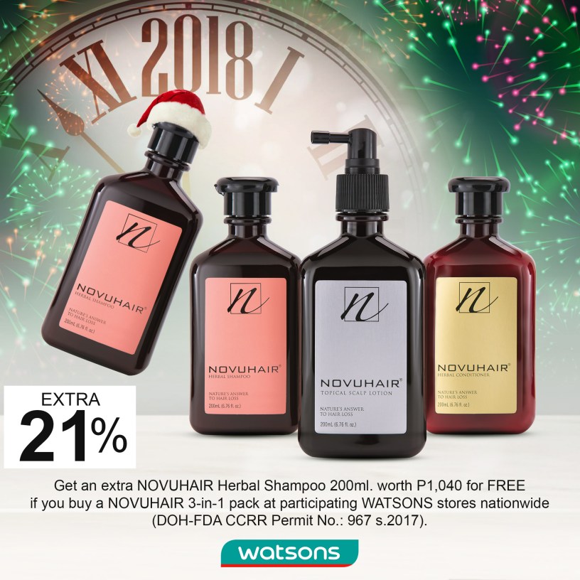 In this time of gratitude, NOVUHAIR makes everyday “a good hair day” for its valued patrons like you with its Christmas and Year-End Promo. Get an extra NOVUHAIR Herbal Shampoo 200 ml. worth P1,040 for FREE if you buy a NOVUHAIR 3-in-1 pack at participating WATSONS stores nationwide (DOH-FDA CCRR Permit No.: 967 s. 2017).