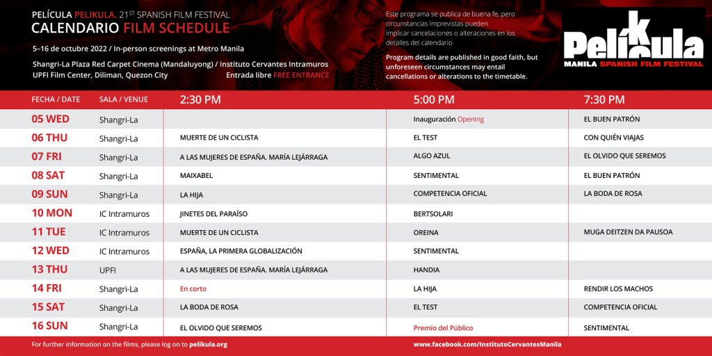 From October 5 to 16, 2022, the 21st edition of PELÍCULA-Spanish Film Festival will return to in-person screenings. After two years of having a virtual festival, PELÍCULA will screen more than twenty movies in three venues of Metro-Manila –Edsa Shangri-La Plaza, Cine Adarna at UP Diliman, and Instituto Cervantes Intramuros branch.