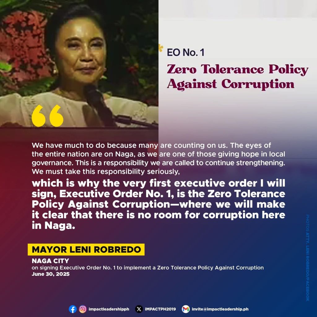 As a Filipino living outside of Naga, I feel nothing but admiration for what Mayor Leni Robredo is doing in her hometown. On July 1, 2025, she signed Executive Order No. 1, enforcing a Zero Tolerance Policy Against Corruption, a move that could easily become the benchmark for local governments across the country.